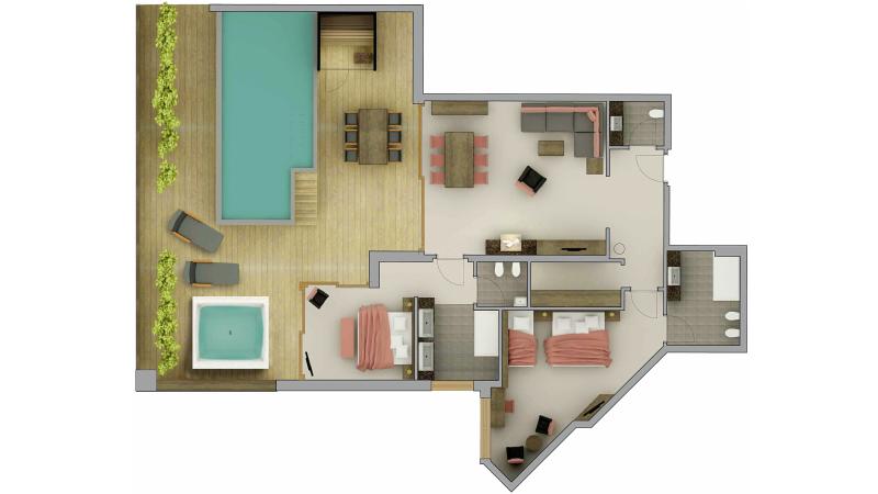 2 – 5 people, 250 m² (of which 120 m² are loggia with private pool, whirlpool, sauna and lounge furniture)