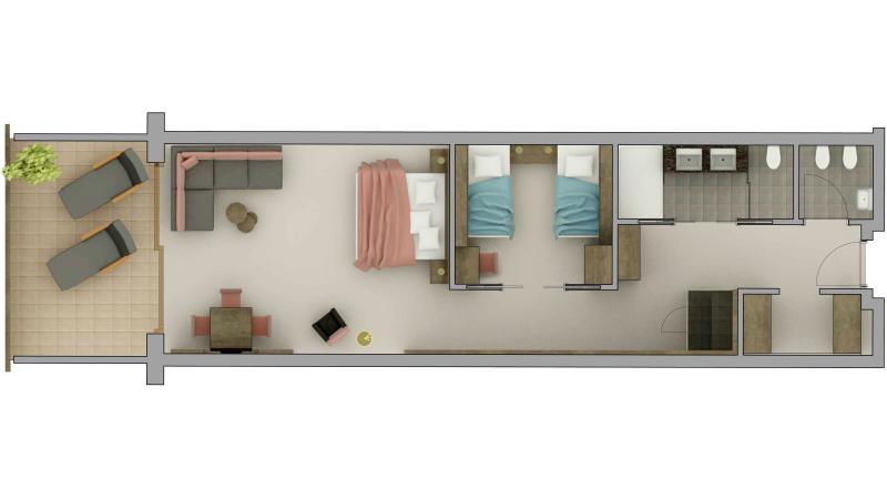 for 2-6 people, approximately 85 m² (including a 15 m2 south-facing loggia), 1 bedroom with comfortable box spring bed, lounge area and infrared wellness cabin, separate children’s room with 2 bunk beds, walk-in wardrobe, wooden flooring and south-facing loggia. Underground parking in Guesthouse P included.