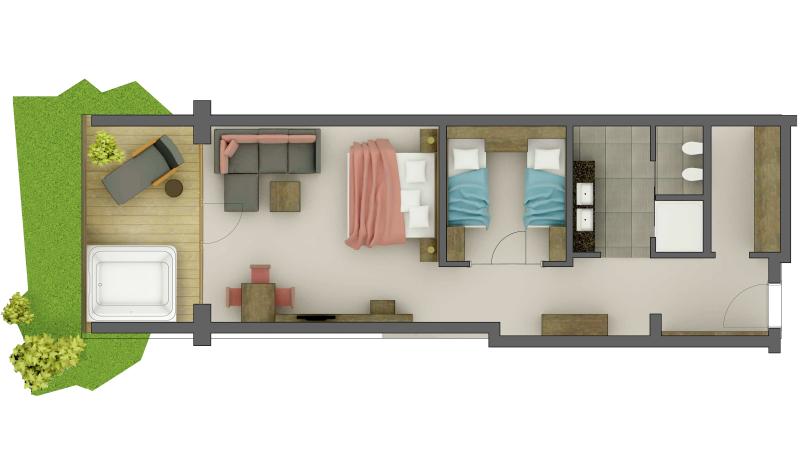 chambre de 80 m² environ (dont 20 m² de loggia) pour 2-5 personnes avec coin séjour inclus, ainsi qu‘une chambre d‘appoint pour enfants avec lits superposés et lit simple (sans fenêtre), salle de bain avec douche et bidet, wc et bidet séparés, dressing, machine à café Nespresso, parquet en bois, terrasse côté sud au rez-de-chaussée avec chaises longues et bain à remous. Parking souterrain dans notre Guesthouse F inclus.
