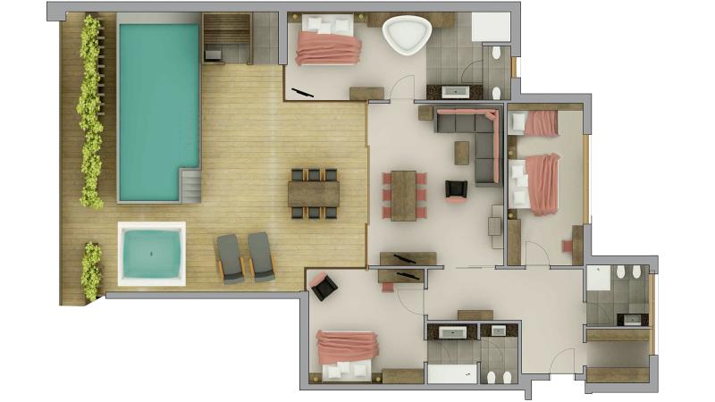 pour 2-7 personnes, 280 m² (dont 125 m² de loge avec piscine privée 9 x 3 m, Whirlpool et meubles lounge). Suite de luxe avec 3 chambres à coucher, dont l’une avec une merveilleuse salle de bain Wellness open space avec baignoire à pieds et douche aventure, WC et bidet à part, lits 200 x 200 VI-Spring, chambre à coucher additionnelle avec lit deux places et une place, salle de bain avec douche, WC et bidet, grande salle de séjour séparée avec table de séjour et coin détente. Équipée de 3 postes de télévision.