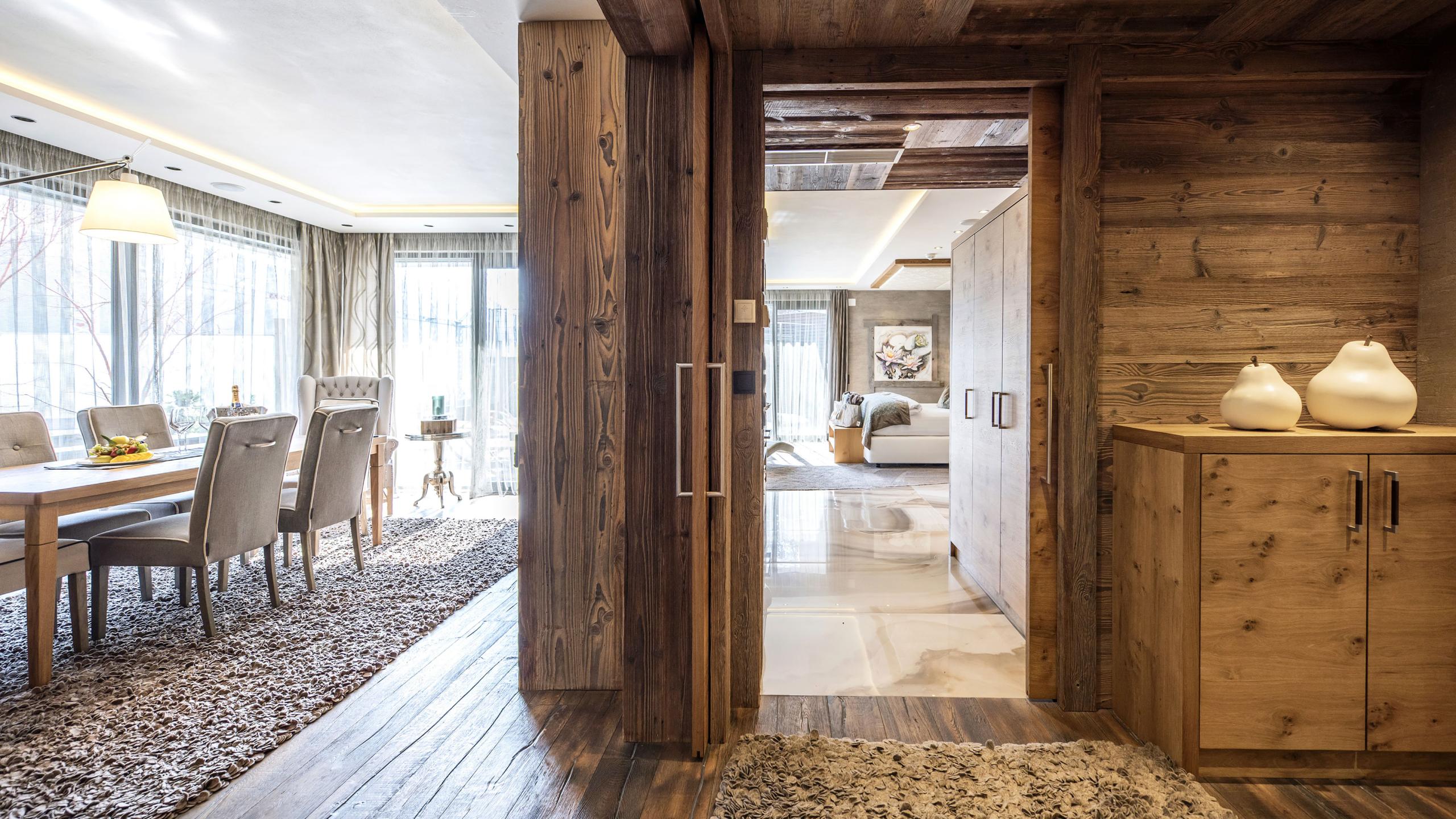 per 2-5 persone, ca. 250 m² (di cui m² riservati ad un’esclusiva terrazza sul tetto). Lussuosa suite composta da 2 camere da letto (la padronale dotata di un meraviglioso bagno wellness open space con vasca da bagno freestanding, letti di lusso VI-Spring e accesso diretto alla terrazza, e la seconda camera di un letto doppio, uno singolo e un bagno), angolo soggiorno con impianto audio multiroom, caminetto, angolo relax, tavolo da pranzo e macchina Nespresso. Sul tetto si trova la terrazza privata con piscina infinity da 9 x 4 m, hot whirlpool, sauna esterna con sistema a infrarossi integrato e un’accogliente zona relax. Garage sotterraneo presso il Guesthouse V incluso.