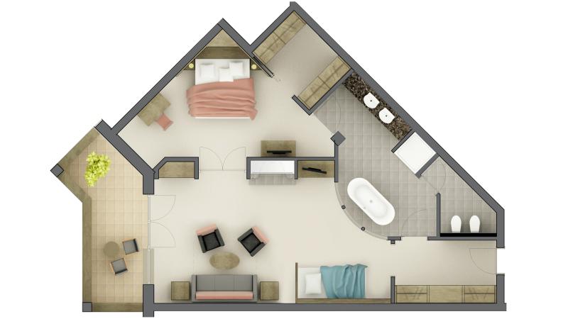 Suite composta da una camera da letto con confortevole letto, cabina armadio, ampio bagno con vasca freestanding, area soggiorno separata con divano-letto e letto a castello, pavimenti in legno e loggia esposta a sud. Garage sotterraneo presso il Guesthouse P incluso.