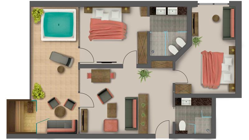 per 2-7 persone, ca. 120m² (di cui 30m² di loggia). Camera da letto con letto matrimoniale, zona living con salottino con divano letto, camera dei bambini con letto matrimoniale e divano letto, 2 bagni con doccia, macchina da caffè Nespresso, pavimento in legno e terrazza a nord con hot whirlpool e sauna privata (vista limitata). Parcheggio interrato presso la Guesthouse F incluso.