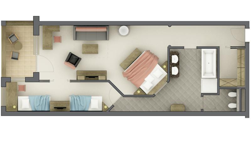 per 2-6 persone, ca. 75 m², Suite composta da un’ampia camera doppia con letti confortevoli e angolo soggiorno con divano-letto, camera separata con 2 letti o letto a castello (parzialmente con finestra), cabina armadio, pavimento in legno e loggia esposta a sud. Garage sotterraneo presso il Guesthouse P incluso.