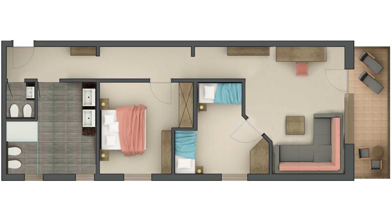 per 2-5 persone, circa 90 m², camera matrimoniale con confortevoli letti boxspring, camera per bambini con letto a castello e letto singolo, soggiorno separato, pavimenti in legno e balcone. Garage sotterraneo presso il Guesthouse F incluso.