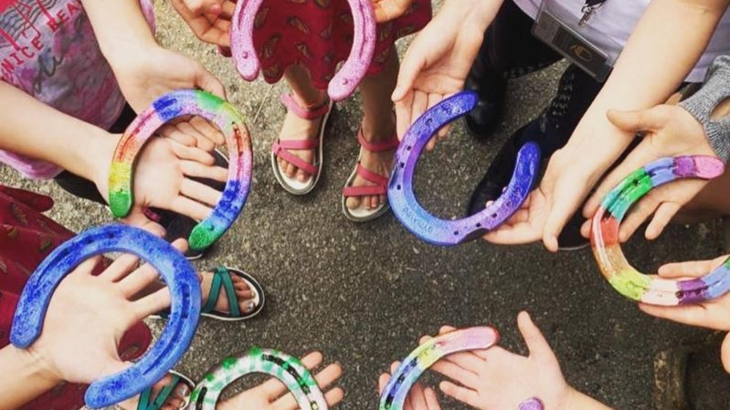I bambini dipingono il ferro di cavallo già disegnato su un foglio di carta con colori per legno. In seguito, i veri ferri di cavallo dei nostri cavalli vengono dipinti con colori acrilici e possono essere portati a casa.