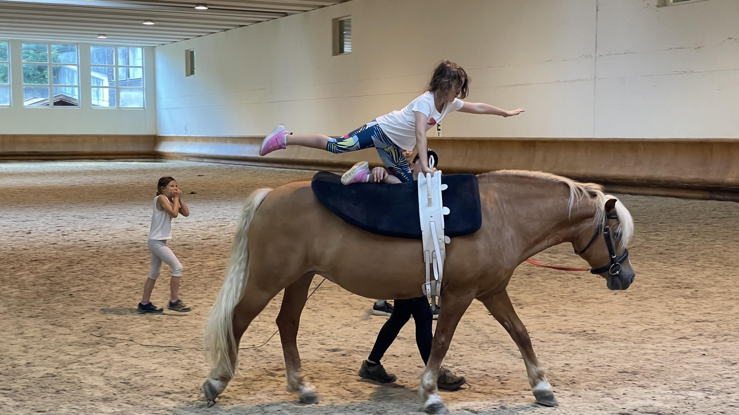 Nel volteggio, gli esercizi ginnici e acrobatici vengono eseguiti su un cavallo che si muove in cerchio su un affondo. Prima i bambini provano gli esercizi con gli istruttori di equitazione, poi viene fatta una breve esibizione per i genitori. Il volteggio di gruppo richiede un minimo di 3 bambini.