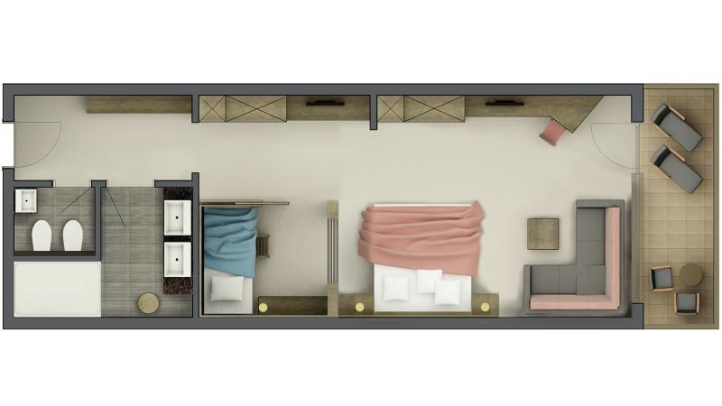 Für 2-4 Personen, ca. 50 m², mit komfortablem Box-Springbett und Sitzecke, separater Schlafkoje mit Stockbett, Holzboden und Balkon. Tiefgarage unter den Tennisplätzen inklusive.