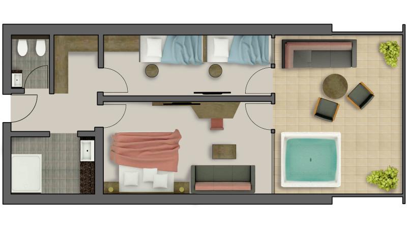 2-5 Personen, ca. 75 m² (davon ca. 18-25 m² Loggia), Südterrasse mit Relaxliegen und Whirlpool