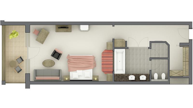 für 2–4 Personen, ca. 60 m², 1-Raum-Suite mit komfortablen Betten, Wohnecke mit ausziehbarer Couch, begehbarem Kleiderschrank, Holzboden und Südloggia. Tiefgarage im Guesthouse P inklusive.